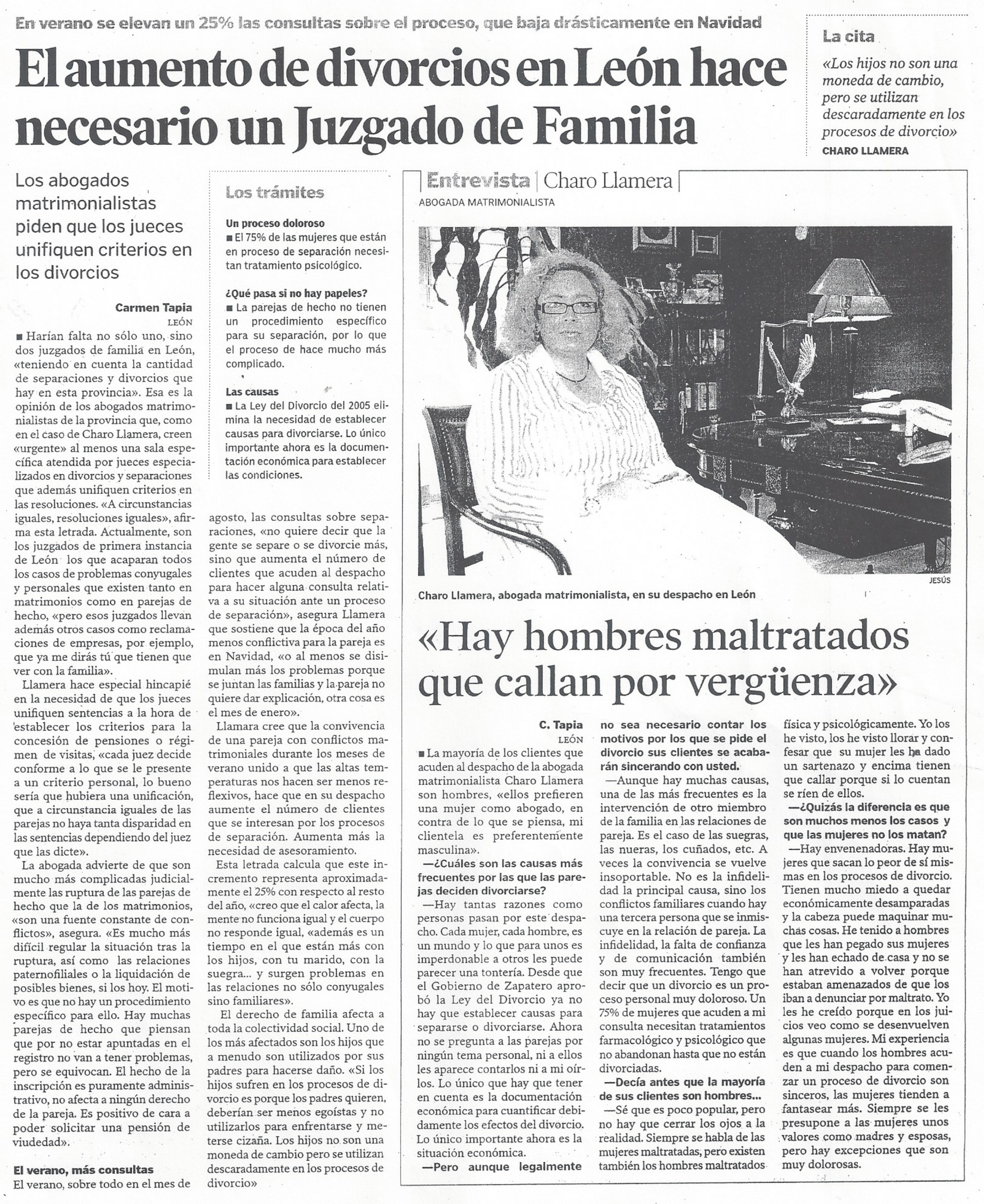 Es tan alto el reconocimiento que tiene Charo Llamera Abogada Matrimonialista, que sus casos de atribución de custodia de menores tienen gran transcendencia en los medios de comunicación nacional. La profesional cuenta con amplia intervención en televisión y radio, además se le han realizado entrevistas para el Diario de León.